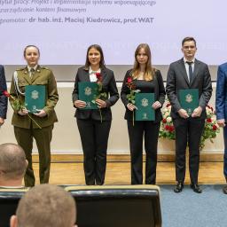 Wyróżnienia otrzymali również absolwenci studiów magisterskich, których prace zostały nagrodzone w konkursie Dziekana. Z kierunku kryptologia i cyberbezpieczeństwo wyróżniono ppor. mgr inż. Maję Czyżewską za pracę “Predykcja wartości wybranych instrumentów finansowych z wykorzystaniem uczenia głębokiego” napisaną pod kierunkiem promotora dr. inż. Romualda Hoffmanna, prof. WAT. Wyróżnienie otrzymał również ppor. mgr inż. Kamil Pociask za pracę “Metoda korekty położenia elementu roju dronów z wykorzystaniem sensorów UWB” napisaną pod opieką merytoryczną dr. hab. inż. Janusza Furtaka, prof. WAT. Z kierunku informatyka nagrodę otrzymał ppor. mgr inż. Patryk Podbielski za pracę “Algorytmy rozpoznawania obiektów i wyznaczania położenia na podstawie zdjęć na platformie mobilnej Android jako rozszerzenia systemu TAK” napisaną pod opieką gen. bryg. dr. inż. Mariusza Chmielewskiego oraz mgr inż. Wioletta Dziwińska za pracę “Metody rozpoznania manipulacji materiałem multimedialnym”, promotorem był płk dr inż. Rafał Kasprzyk.